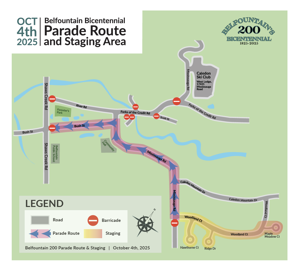 Please give yourself time to park at the Caledon Ski Club West Lodge, 17431 Mississauga Rd. and catch the shuttle into Belfountain’s Festival area. Parade starts at 11am.
